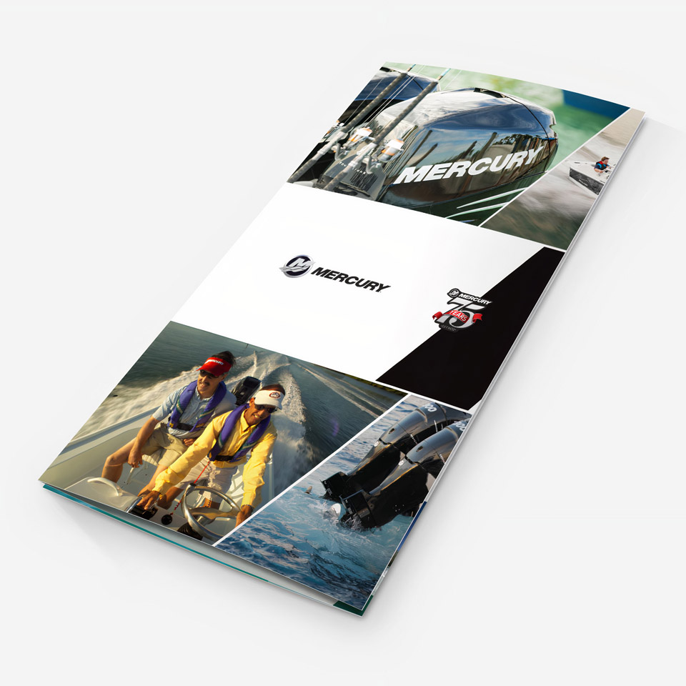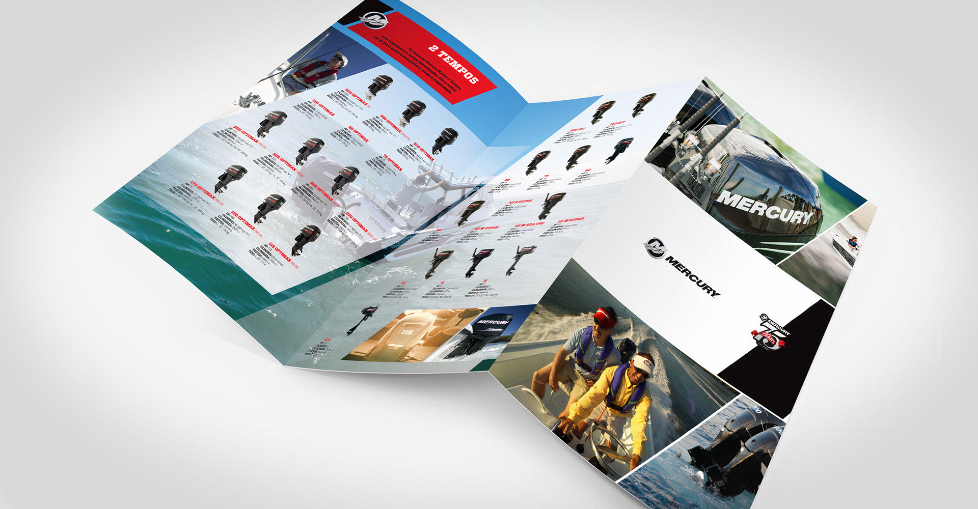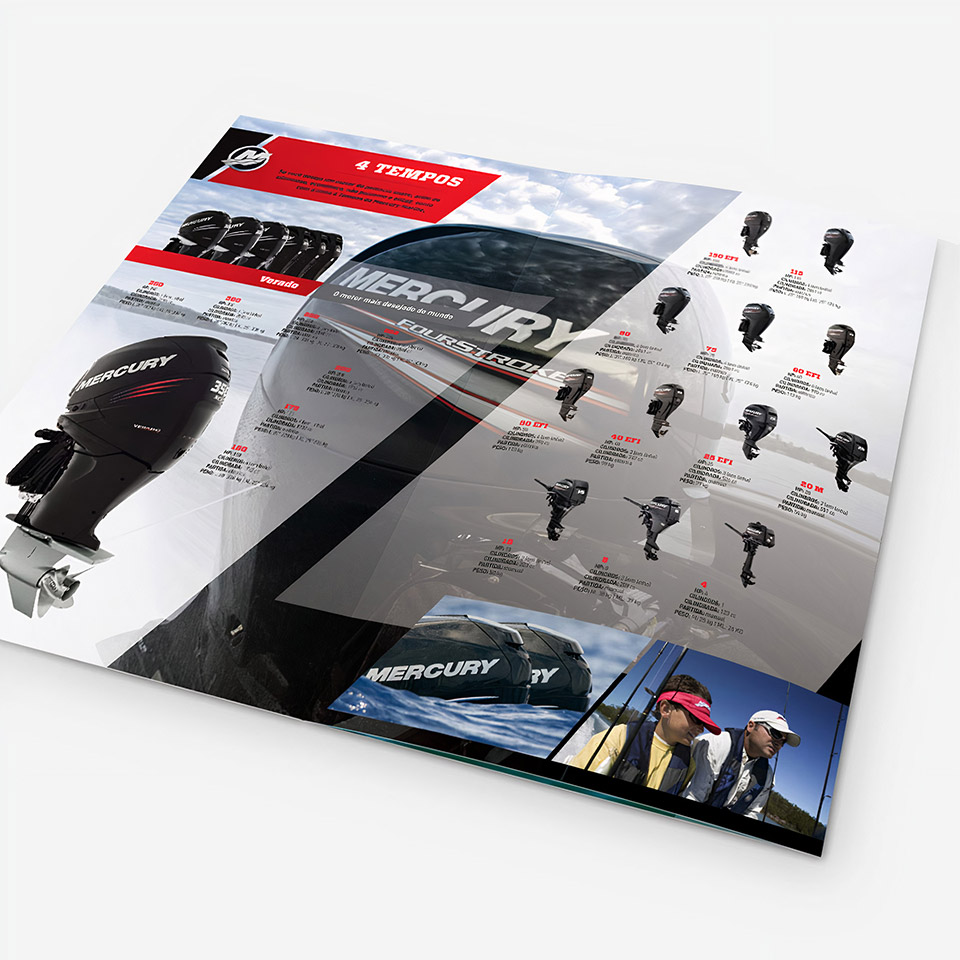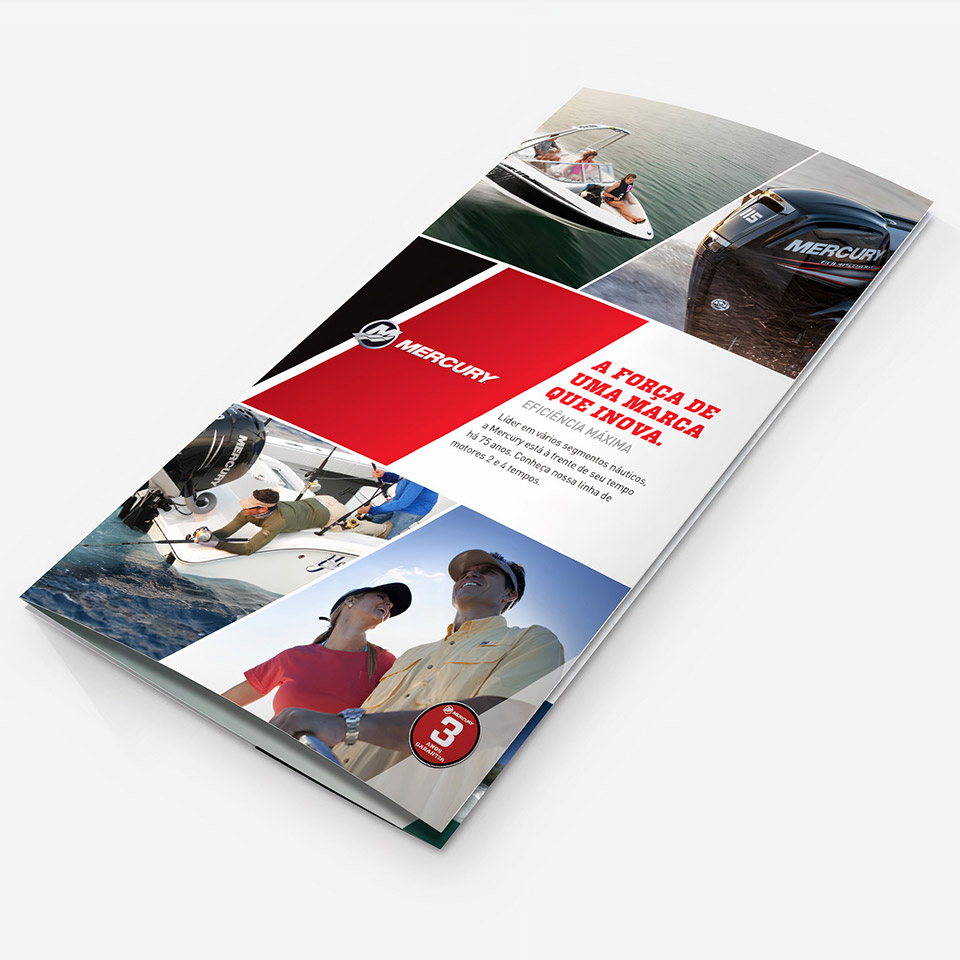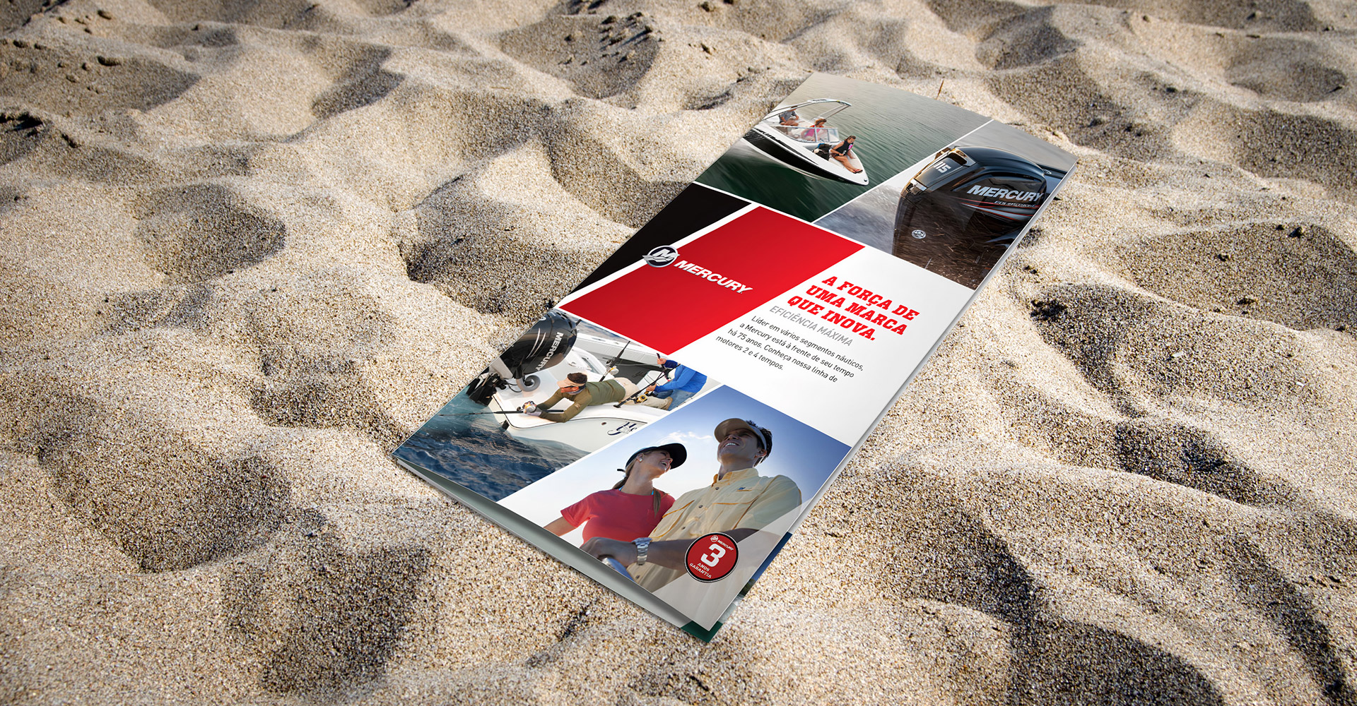 A Mercury Marine pediu-nos um fôlder/catálogo para sua linha de produtos, solicitando que o material não tivesse aparência técnica, de um portfólio de produtos industriais. Os conceitos da marca, como estilo de vida e modernidade, deveriam estar presentes.